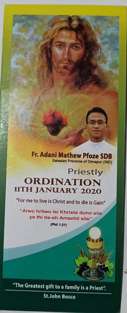 Dn. Phuvito Emmanuel SDB, will be ordained a priest tomorrow (16 January 2020) by Rt. Rev. James Thoppil, DD, the bishop of Kohima diocese. Dn Emmanuel did his theological studies at Sacred Heart Theological College, Shillong and he belongs to Salesian Province of Dimapur.